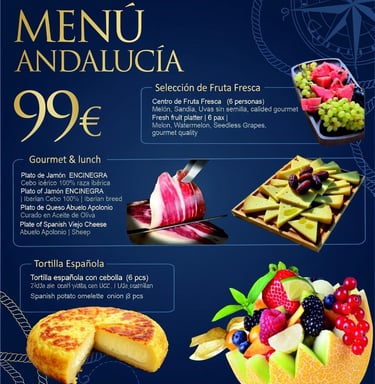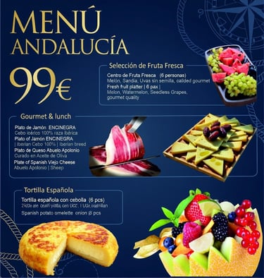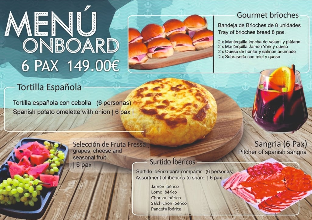 Skip the hassle board includes juicy Spanish tortilla top shelf ibéricos fresh fruit platter a big jug of Sangria for six. We load it up before we sail. Just nod and we´re done.